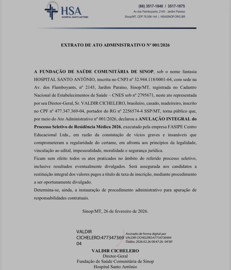 O Hospital Santo Antônio informa que, por meio do Ato Administrativo nº 001/2026, foi declarada a anulação integral do Processo Seletivo de Residência Médica 2026, em razão da constatação de vícios graves que comprometeram a regularidade do certame.